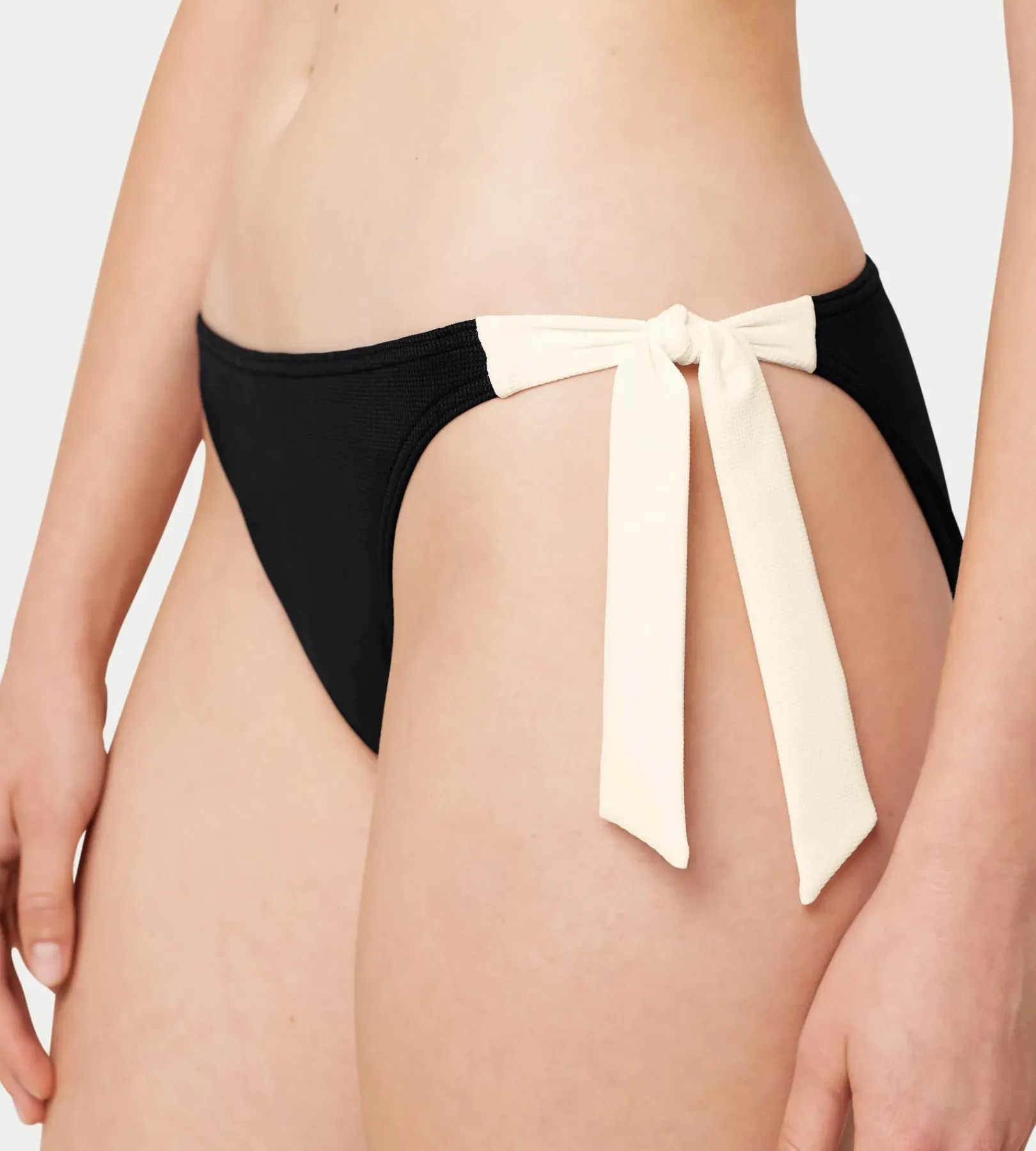 Eleganckie i ekologiczne. Zaprojektowaliśmy te ponadczasowe majtki od bikini z tkaniny typu pika pochodzącej z recyklingu. Umożliwiające regulację sznurki po bokach gwarantują idealne dopasowanie do Twojej sylwetki.