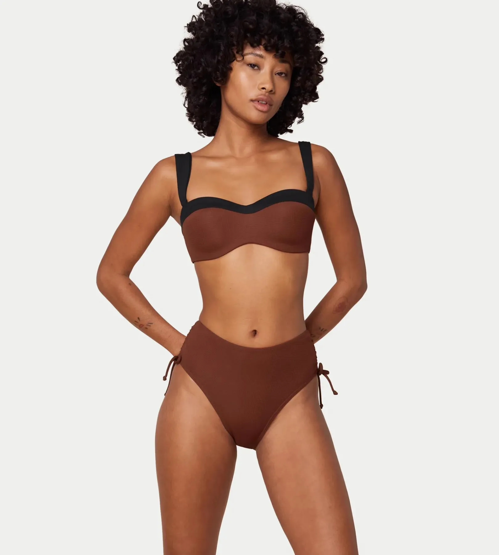 Te majtki od bikini o dużej powierzchni krycia płynnie łączą w sobie elegancję i świadomość ekologiczną. Zaprojektowaliśmy je z tkaniny typu pika pochodzącej z recyklingu, która gwarantuje naturalnie elegancki wygląd.