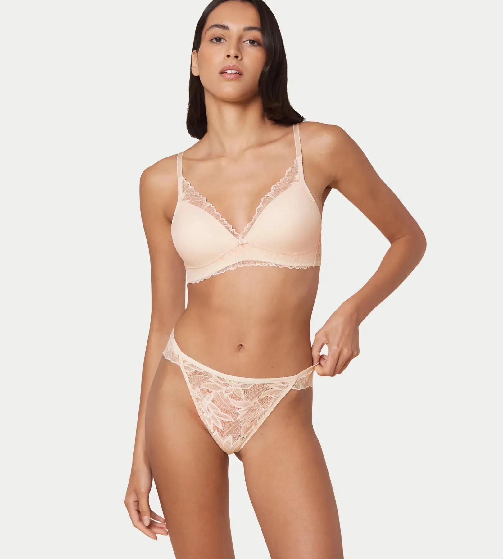- Miękka, jasna dwukolorowa koronka i lśniące paseczki