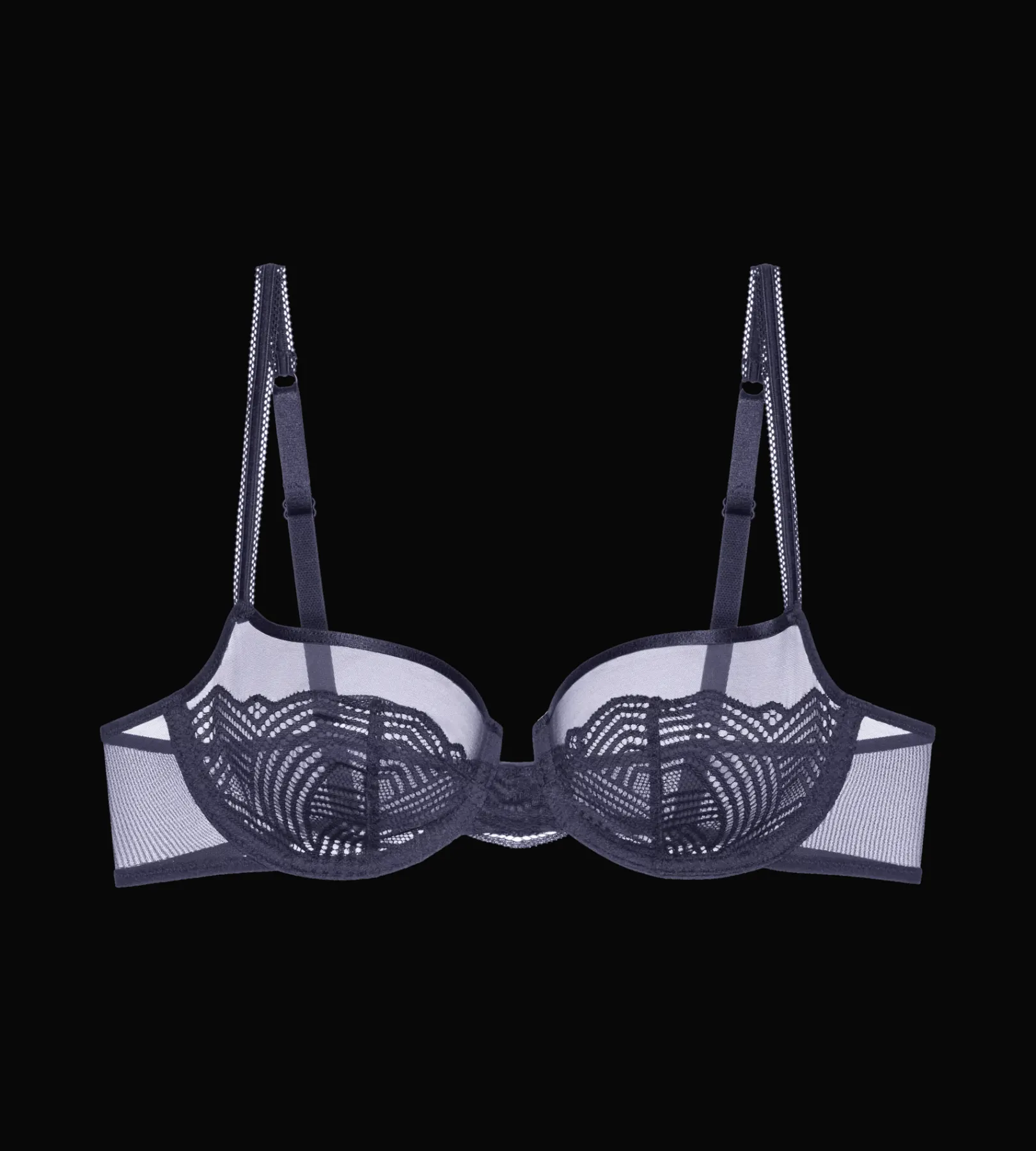 - Delikatna koronka i tiul wzdłuż wewnętrznej krawędzi miseczki