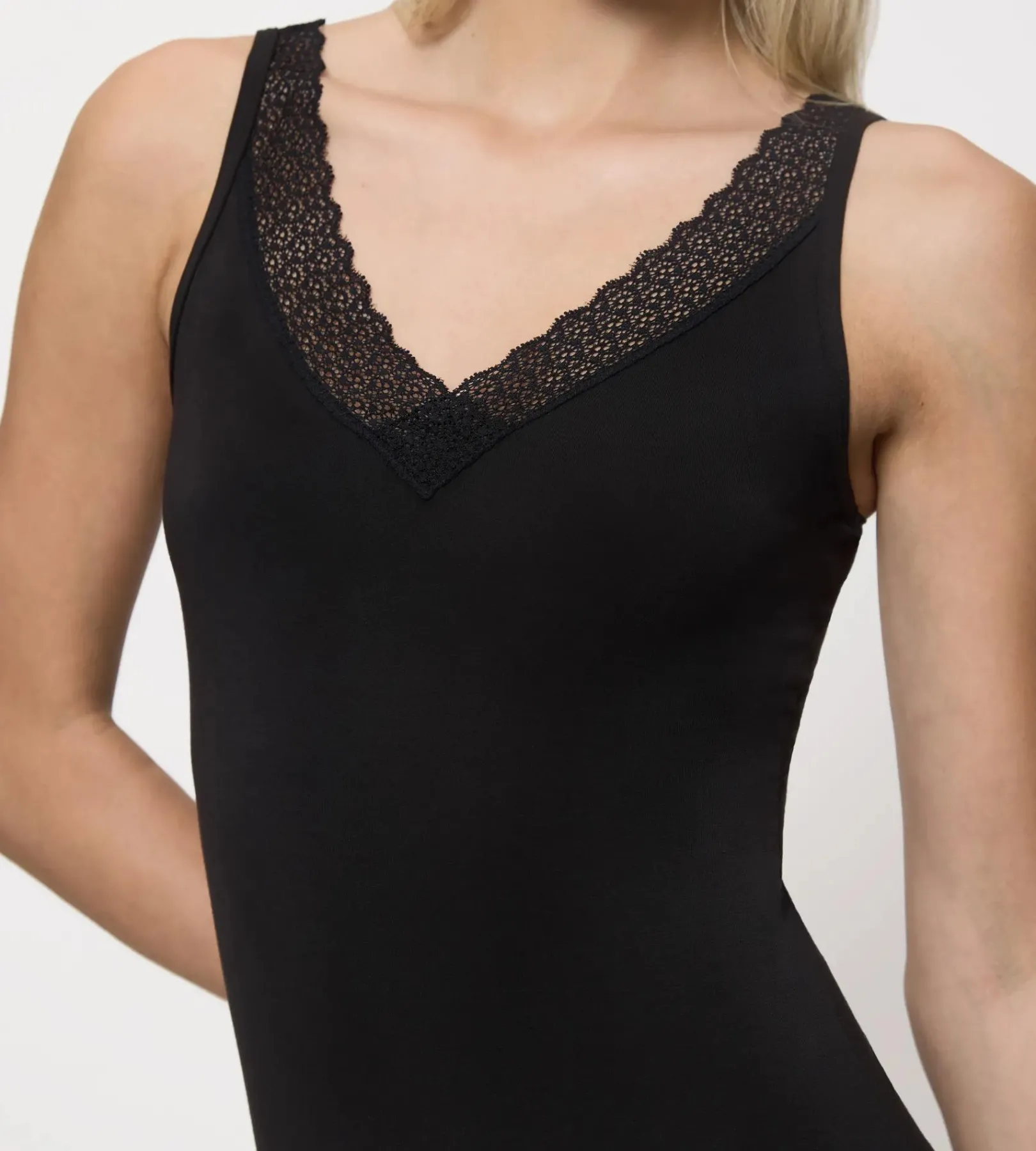 - Koronkowe detale z recyklingu jako wykończenie dekoltu w kształcie litery V